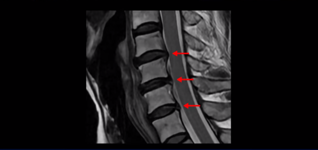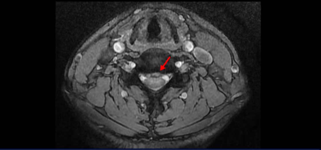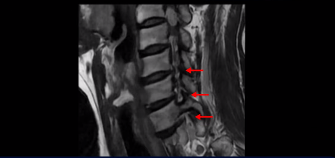 이분 MRI를 보면 세 마디의 퇴행성 목디스크가 있습니다. 4번 5번, 5번 6번과 6번 7번이 세 마디인데