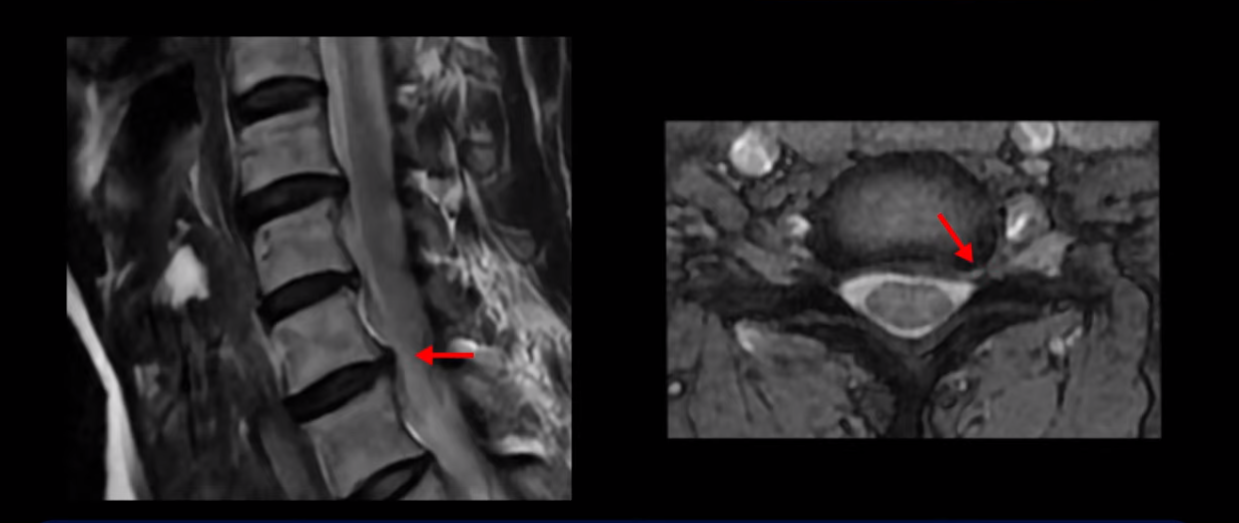 중앙 오른쪽으로 수핵이 밀려 나와있고 밑으로 흘러 내려가 있습니다.