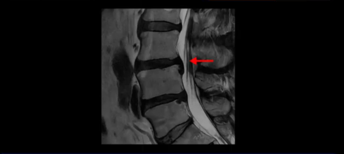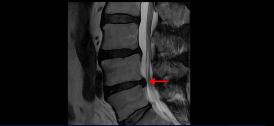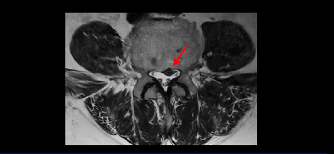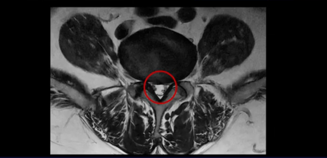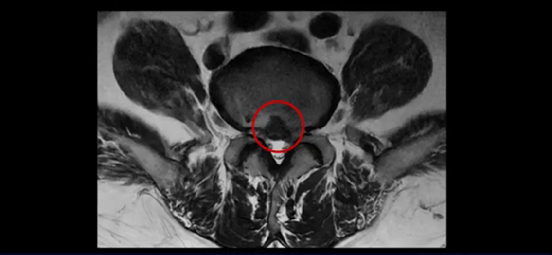 보시다시피 흘러 내려온 디스크 수핵이 신경 공간의 왼쪽으로 보입니다.