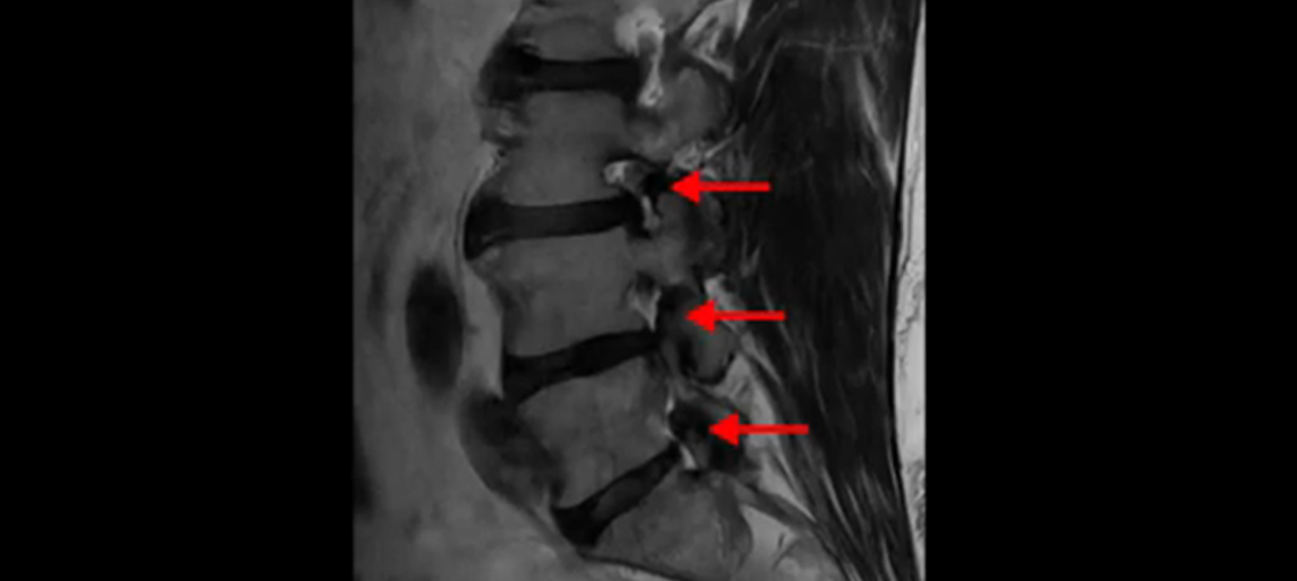 이분 MRI를 잠깐 보실까요? 보시면 두 마디가 특히 안 좋은데 3번 4번 디스크가 터져서 흘러 내려 있습니다.