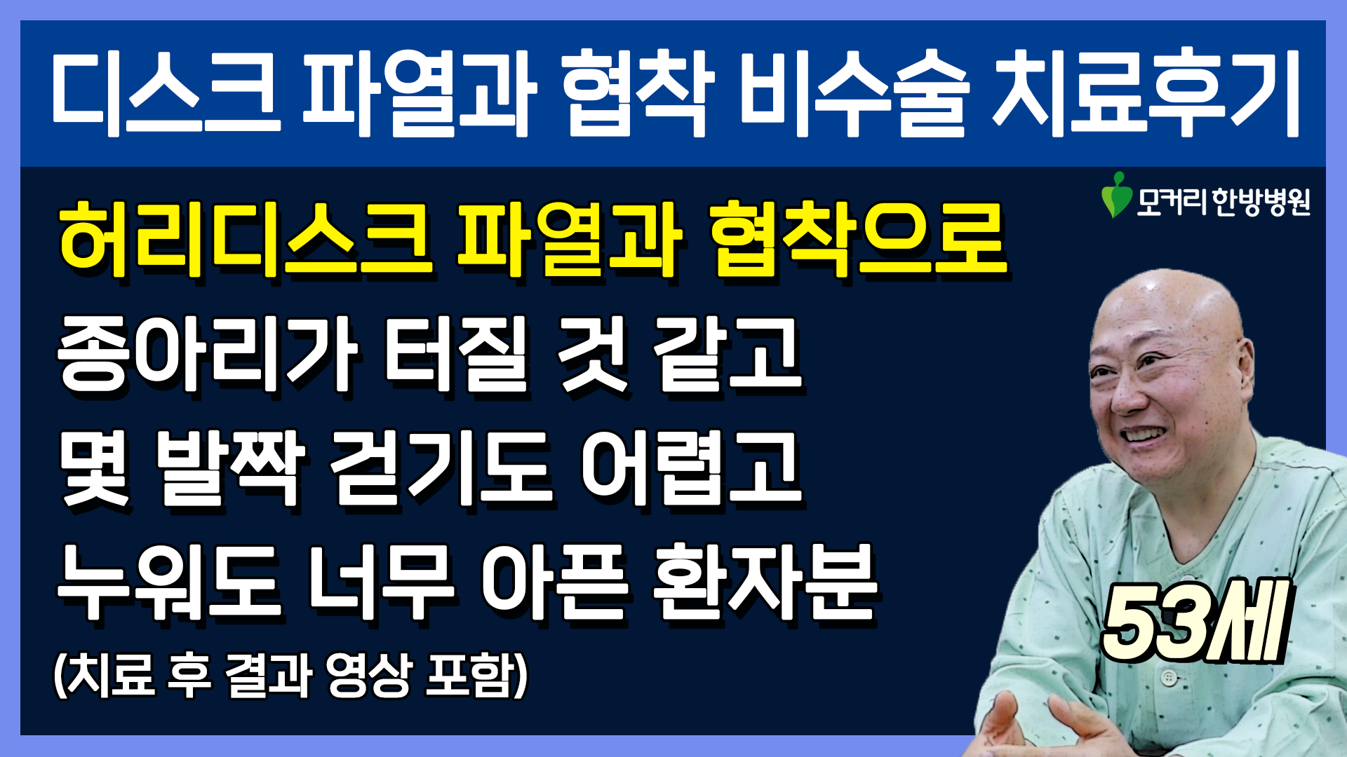 그럼 이 환자분은 3주의 입원치료를 받으셨는데요. 치료 결과는 과연 어떻게 되었을까요? 엉덩이와 장딴지가 터질 것 같이 극심하게 아프다고 한 증상들이 완전히 사라지셨을까요? 몇 발자국 걷지도 못하고, 앉았다 서지도 못하고, 누워서도 아프다고 한 증상들이 회복이 되셨을까요? 이분의 치료 후 결과가 궁금하시다면 아래 영상을 꼭 보시길 바랍니다.
