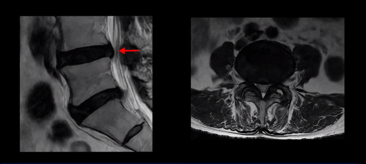 MRI를 보면서 설명해 드리겠습니다. 2마디에 퇴행성디스크가 있는데 심하지는 않습니다.